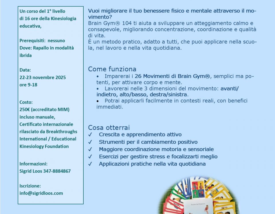Brain Gym 104® ti aiuta a sviluppare un atteggiamento calmo e consapevole, migliorando osservazione, coordinazione e qualità della vita.