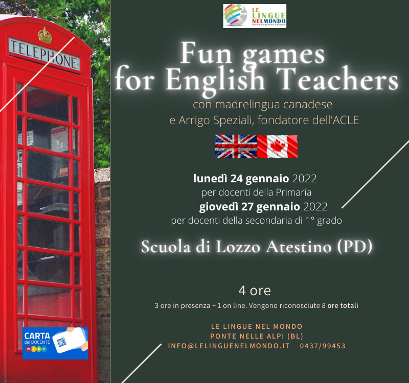 Costo del corso di 4 ore (3+1 e 8 riconosciute): € 30 saldabili con Carta Docente. Tessera associativa per i docenti offerta da Le Lingue nel Mondo, valida fino al 31.12.2022